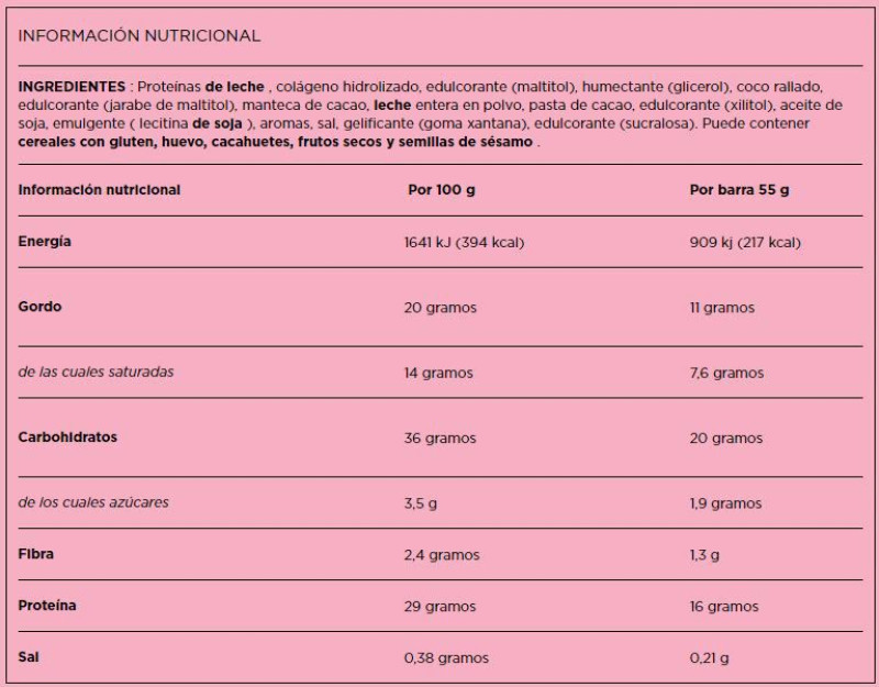 La combinación de coco con chocolate crea un perfil de sabor equilibrado que recuerda a postres clásicos, pero con un enfoque nutricional adaptado al mundo fitness. Es ideal para quienes buscan una barrita proteica sabrosa sin excesos de azúcar.
